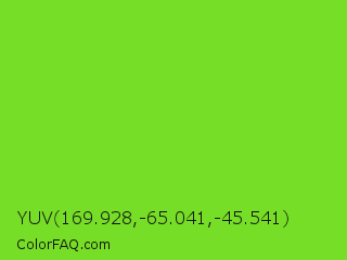 YUV 169.928,-65.041,-45.541 Color is a normal green color and the nearest color is Kiwi #8ee53f. Hex code #76de26 and RGB value is rgb(118,222,38). In RGB color space, this color is composed of 46% red, 87% green, 15% blue, In CMYK color space, this color is composed of 47% cyan, 0% magenta, 83% yellow , 13% black , In HSL color space, this color has a hue angle of 94° , 74% saturation and 51% lightness.