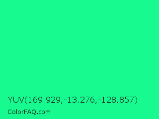 YUV 169.929,-13.276,-128.857 Color is a normal green color and the nearest color is Medium Spring Green #00fa9a. Hex code #17fa8f and RGB value is rgb(23,250,143). In RGB color space, this color is composed of 9% red, 98% green, 56% blue, In CMYK color space, this color is composed of 91% cyan, 0% magenta, 43% yellow , 2% black , In HSL color space, this color has a hue angle of 152° , 96% saturation and 54% lightness.