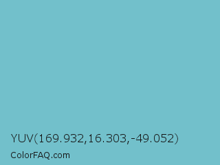 YUV 169.932,16.303,-49.052 Color is a light cyan color and the nearest color is Downy #6fd0c5. Hex code #72c0cb and RGB value is rgb(114,192,203). In RGB color space, this color is composed of 45% red, 75% green, 80% blue, In CMYK color space, this color is composed of 44% cyan, 5% magenta, 0% yellow , 20% black , In HSL color space, this color has a hue angle of 187° , 46% saturation and 62% lightness.