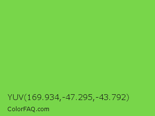 YUV 169.934,-47.295,-43.792 Color is a normal green color and the nearest color is Kiwi #8ee53f. Hex code #78d64a and RGB value is rgb(120,214,74). In RGB color space, this color is composed of 47% red, 84% green, 29% blue, In CMYK color space, this color is composed of 44% cyan, 0% magenta, 65% yellow , 16% black , In HSL color space, this color has a hue angle of 100° , 63% saturation and 56% lightness.