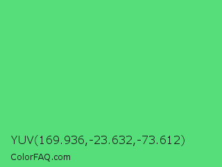 YUV 169.936,-23.632,-73.612 Color is a normal green color and the nearest color is Very Light Malachite Green #64e986. Hex code #56de7a and RGB value is rgb(86,222,122). In RGB color space, this color is composed of 34% red, 87% green, 48% blue, In CMYK color space, this color is composed of 61% cyan, 0% magenta, 45% yellow , 13% black , In HSL color space, this color has a hue angle of 136° , 67% saturation and 60% lightness.