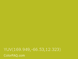 YUV 169.949,-66.53,12.323 Color is a normal yellow color and the nearest color is Acid Green #b0bf1a. Hex code #b8bd23 and RGB value is rgb(184,189,35). In RGB color space, this color is composed of 72% red, 74% green, 14% blue, In CMYK color space, this color is composed of 3% cyan, 0% magenta, 81% yellow , 26% black , In HSL color space, this color has a hue angle of 62° , 69% saturation and 44% lightness.