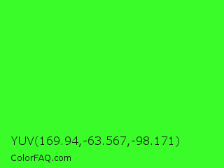 YUV 169.94,-63.567,-98.171 Color is a normal green color and the nearest color is Neon Green #39ff14. Hex code #3afc29 and RGB value is rgb(58,252,41). In RGB color space, this color is composed of 23% red, 99% green, 16% blue, In CMYK color space, this color is composed of 77% cyan, 0% magenta, 84% yellow , 1% black , In HSL color space, this color has a hue angle of 115° , 97% saturation and 57% lightness.