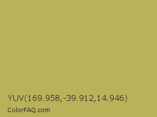 YUV 169.958,-39.912,14.946 Color is a normal yellow color and the nearest color is Olive Green #b5b35c. Hex code #bbb159 and RGB value is rgb(187,177,89). In RGB color space, this color is composed of 73% red, 69% green, 35% blue, In CMYK color space, this color is composed of 0% cyan, 5% magenta, 52% yellow , 27% black , In HSL color space, this color has a hue angle of 54° , 42% saturation and 54% lightness.