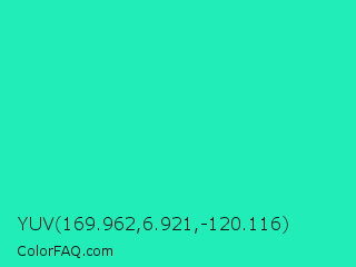 YUV 169.962,6.921,-120.116 Color is a normal cyan color and the nearest color is Turquoise PWG #30d5c8. Hex code #21edb8 and RGB value is rgb(33,237,184). In RGB color space, this color is composed of 13% red, 93% green, 72% blue, In CMYK color space, this color is composed of 86% cyan, 0% magenta, 22% yellow , 7% black , In HSL color space, this color has a hue angle of 164° , 85% saturation and 53% lightness.