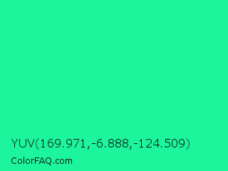 YUV 169.971,-6.888,-124.509 Color is a normal green color and the nearest color is Medium Spring Green #00fa9a. Hex code #1cf59c and RGB value is rgb(28,245,156). In RGB color space, this color is composed of 11% red, 96% green, 61% blue, In CMYK color space, this color is composed of 89% cyan, 0% magenta, 36% yellow , 4% black , In HSL color space, this color has a hue angle of 155° , 92% saturation and 54% lightness.