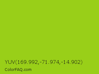 YUV 169.992,-71.974,-14.902 Color is a normal lime color and the nearest color is Bahia #a5cb0c. Hex code #99cf18 and RGB value is rgb(153,207,24). In RGB color space, this color is composed of 60% red, 81% green, 9% blue, In CMYK color space, this color is composed of 26% cyan, 0% magenta, 88% yellow , 19% black , In HSL color space, this color has a hue angle of 78° , 79% saturation and 45% lightness.