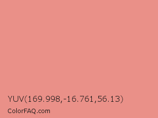 YUV 169.998,-16.761,56.13 Color is a light red color and the nearest color is Dark Salmon #e9967a. Hex code #ea9088 and RGB value is rgb(234,144,136). In RGB color space, this color is composed of 92% red, 56% green, 53% blue, In CMYK color space, this color is composed of 0% cyan, 38% magenta, 42% yellow , 8% black , In HSL color space, this color has a hue angle of 5° , 70% saturation and 73% lightness.