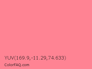 YUV 169.9,-11.29,74.633 Color is a light red color and the nearest color is Tulip #ff878d. Hex code #ff8393 and RGB value is rgb(255,131,147). In RGB color space, this color is composed of 100% red, 51% green, 58% blue, In CMYK color space, this color is composed of 0% cyan, 49% magenta, 42% yellow , 0% black , In HSL color space, this color has a hue angle of 352° , 100% saturation and 76% lightness.