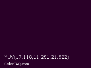 YUV 17.118,11.281,21.822 Color is a almost black magenta color and the nearest color is Jacaranda #2e0329. Hex code #2a0028 and RGB value is rgb(42,-0,40). In RGB color space, this color is composed of 16% red, 0% green, 16% blue, In CMYK color space, this color is composed of 0% cyan, 100% magenta, 5% yellow , 84% black , In HSL color space, this color has a hue angle of 303° , 100% saturation and 8% lightness.