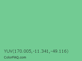 YUV 170.005,-11.341,-49.116 Color is a light green color and the nearest color is De York #7ac488. Hex code #72cb93 and RGB value is rgb(114,203,147). In RGB color space, this color is composed of 45% red, 80% green, 58% blue, In CMYK color space, this color is composed of 44% cyan, 0% magenta, 28% yellow , 20% black , In HSL color space, this color has a hue angle of 142° , 46% saturation and 62% lightness.