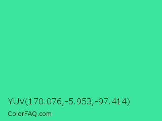 YUV 170.076,-5.953,-97.414 Color is a normal green color and the nearest color is Eucalyptus #44d7a8. Hex code #3be59e and RGB value is rgb(59,229,158). In RGB color space, this color is composed of 23% red, 90% green, 62% blue, In CMYK color space, this color is composed of 74% cyan, 0% magenta, 31% yellow , 10% black , In HSL color space, this color has a hue angle of 155° , 77% saturation and 56% lightness.