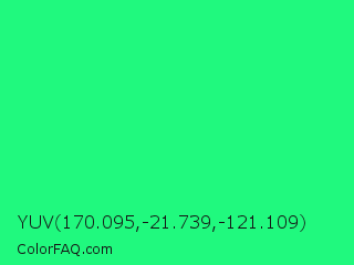 YUV 170.095,-21.739,-121.109 Color is a normal green color and the nearest color is Spring Green #00ff7f. Hex code #20f97e and RGB value is rgb(32,249,126). In RGB color space, this color is composed of 13% red, 98% green, 49% blue, In CMYK color space, this color is composed of 87% cyan, 0% magenta, 49% yellow , 2% black , In HSL color space, this color has a hue angle of 146° , 95% saturation and 55% lightness.