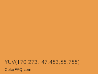 YUV 170.273,-47.463,56.766 Color is a light orange color and the nearest color is Indian Yellow #e3a857. Hex code #eb9c4a and RGB value is rgb(235,156,74). In RGB color space, this color is composed of 92% red, 61% green, 29% blue, In CMYK color space, this color is composed of 0% cyan, 34% magenta, 69% yellow , 8% black , In HSL color space, this color has a hue angle of 31° , 80% saturation and 61% lightness.