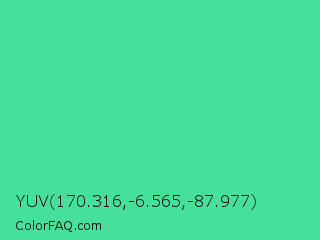 YUV 170.316,-6.565,-87.977 Color is a normal green color and the nearest color is Eucalyptus #44d7a8. Hex code #46e09d and RGB value is rgb(70,224,157). In RGB color space, this color is composed of 27% red, 88% green, 62% blue, In CMYK color space, this color is composed of 69% cyan, 0% magenta, 30% yellow , 12% black , In HSL color space, this color has a hue angle of 154° , 71% saturation and 58% lightness.