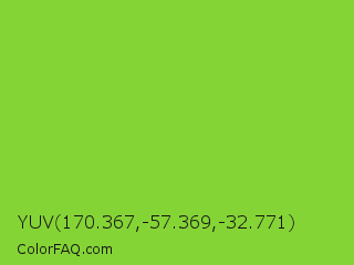 YUV 170.367,-57.369,-32.771 Color is a normal green color and the nearest color is Kiwi #8ee53f. Hex code #85d436 and RGB value is rgb(133,212,54). In RGB color space, this color is composed of 52% red, 83% green, 21% blue, In CMYK color space, this color is composed of 37% cyan, 0% magenta, 75% yellow , 17% black , In HSL color space, this color has a hue angle of 90° , 65% saturation and 52% lightness.