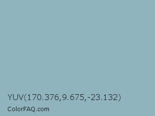 YUV 170.376,9.675,-23.132 Color is a light cyan color and the nearest color is Nepal #8eabc1. Hex code #90b4be and RGB value is rgb(144,180,190). In RGB color space, this color is composed of 56% red, 71% green, 75% blue, In CMYK color space, this color is composed of 24% cyan, 5% magenta, 0% yellow , 25% black , In HSL color space, this color has a hue angle of 193° , 26% saturation and 65% lightness.