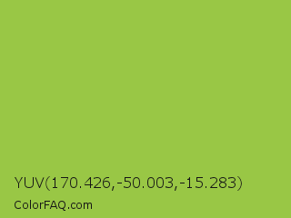 YUV 170.426,-50.003,-15.283 Color is a normal green color and the nearest color is Android Green #a4c639. Hex code #99c745 and RGB value is rgb(153,199,69). In RGB color space, this color is composed of 60% red, 78% green, 27% blue, In CMYK color space, this color is composed of 23% cyan, 0% magenta, 65% yellow , 22% black , In HSL color space, this color has a hue angle of 81° , 54% saturation and 53% lightness.
