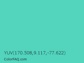 YUV 170.508,9.117,-77.622 Color is a normal cyan color and the nearest color is Medium Turquoise #48d1cc. Hex code #52d4bd and RGB value is rgb(82,212,189). In RGB color space, this color is composed of 32% red, 83% green, 74% blue, In CMYK color space, this color is composed of 61% cyan, 0% magenta, 11% yellow , 17% black , In HSL color space, this color has a hue angle of 169° , 60% saturation and 58% lightness.