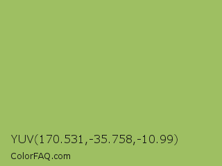 YUV 170.531,-35.758,-10.99 Color is a normal green color and the nearest color is Middle Green Yellow #acbf60. Hex code #9ebf62 and RGB value is rgb(158,191,98). In RGB color space, this color is composed of 62% red, 75% green, 38% blue, In CMYK color space, this color is composed of 17% cyan, 0% magenta, 49% yellow , 25% black , In HSL color space, this color has a hue angle of 81° , 42% saturation and 57% lightness.