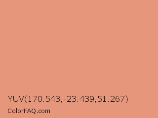 YUV 170.543,-23.439,51.267 Color is a light color and the nearest color is Dark Salmon #e9967a. Hex code #e5967b and RGB value is rgb(229,150,123). In RGB color space, this color is composed of 90% red, 59% green, 48% blue, In CMYK color space, this color is composed of 0% cyan, 34% magenta, 46% yellow , 10% black , In HSL color space, this color has a hue angle of 15° , 67% saturation and 69% lightness.