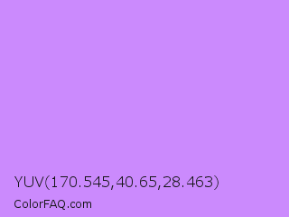 YUV 170.545,40.65,28.463 Color is a light purple color and the nearest color is Pale Violet #cc99ff. Hex code #cb8afd and RGB value is rgb(203,138,253). In RGB color space, this color is composed of 80% red, 54% green, 99% blue, In CMYK color space, this color is composed of 20% cyan, 45% magenta, 0% yellow , 1% black , In HSL color space, this color has a hue angle of 274° , 97% saturation and 77% lightness.