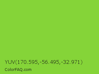 YUV 170.595,-56.495,-32.971 Color is a normal green color and the nearest color is Kiwi #8ee53f. Hex code #85d438 and RGB value is rgb(133,212,56). In RGB color space, this color is composed of 52% red, 83% green, 22% blue, In CMYK color space, this color is composed of 37% cyan, 0% magenta, 74% yellow , 17% black , In HSL color space, this color has a hue angle of 90° , 64% saturation and 53% lightness.