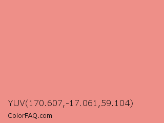 YUV 170.607,-17.061,59.104 Color is a light red color and the nearest color is Geraldine #fb8989. Hex code #ee8f88 and RGB value is rgb(238,143,136). In RGB color space, this color is composed of 93% red, 56% green, 53% blue, In CMYK color space, this color is composed of 0% cyan, 40% magenta, 43% yellow , 7% black , In HSL color space, this color has a hue angle of 4° , 75% saturation and 73% lightness.