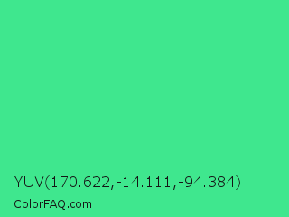 YUV 170.622,-14.111,-94.384 Color is a normal green color and the nearest color is Eucalyptus #44d7a8. Hex code #3fe78e and RGB value is rgb(63,231,142). In RGB color space, this color is composed of 25% red, 91% green, 56% blue, In CMYK color space, this color is composed of 73% cyan, 0% magenta, 39% yellow , 9% black , In HSL color space, this color has a hue angle of 148° , 78% saturation and 58% lightness.