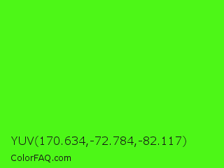 YUV 170.634,-72.784,-82.117 Color is a normal green color and the nearest color is Neon Green #39ff14. Hex code #4df717 and RGB value is rgb(77,247,23). In RGB color space, this color is composed of 30% red, 97% green, 9% blue, In CMYK color space, this color is composed of 69% cyan, 0% magenta, 91% yellow , 3% black , In HSL color space, this color has a hue angle of 106° , 93% saturation and 53% lightness.