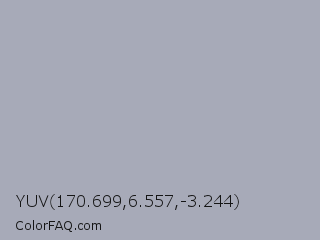 YUV 170.699,6.557,-3.244 Color is a light blue color and the nearest color is Spun Pearl #aaabb7. Hex code #a7aab8 and RGB value is rgb(167,170,184). In RGB color space, this color is composed of 65% red, 67% green, 72% blue, In CMYK color space, this color is composed of 9% cyan, 8% magenta, 0% yellow , 28% black , In HSL color space, this color has a hue angle of 229° , 11% saturation and 69% lightness.