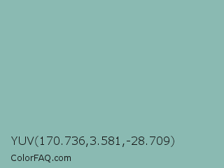 YUV 170.736,3.581,-28.709 Color is a light cyan color and the nearest color is Gulf Stream #80b3ae. Hex code #8abab2 and RGB value is rgb(138,186,178). In RGB color space, this color is composed of 54% red, 73% green, 70% blue, In CMYK color space, this color is composed of 26% cyan, 0% magenta, 4% yellow , 27% black , In HSL color space, this color has a hue angle of 170° , 26% saturation and 64% lightness.