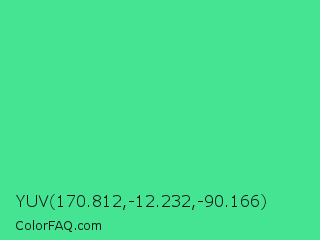 YUV 170.812,-12.232,-90.166 Color is a normal green color and the nearest color is Eucalyptus #44d7a8. Hex code #44e492 and RGB value is rgb(68,228,146). In RGB color space, this color is composed of 27% red, 89% green, 57% blue, In CMYK color space, this color is composed of 70% cyan, 0% magenta, 36% yellow , 11% black , In HSL color space, this color has a hue angle of 149° , 75% saturation and 58% lightness.