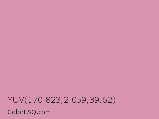 YUV 170.823,2.059,39.62 Color is a light rose color and the nearest color is Can Can #d591a4. Hex code #d893af and RGB value is rgb(216,147,175). In RGB color space, this color is composed of 85% red, 58% green, 69% blue, In CMYK color space, this color is composed of 0% cyan, 32% magenta, 19% yellow , 15% black , In HSL color space, this color has a hue angle of 336° , 47% saturation and 71% lightness.