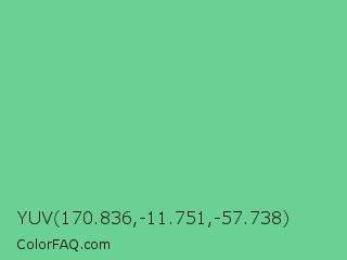 YUV 170.836,-11.751,-57.738 Color is a light green color and the nearest color is De York #7ac488. Hex code #69d193 and RGB value is rgb(105,209,147). In RGB color space, this color is composed of 41% red, 82% green, 58% blue, In CMYK color space, this color is composed of 50% cyan, 0% magenta, 30% yellow , 18% black , In HSL color space, this color has a hue angle of 144° , 53% saturation and 62% lightness.