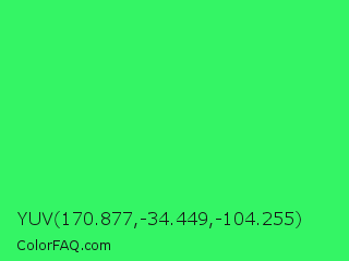 YUV 170.877,-34.449,-104.255 Color is a normal green color and the nearest color is UFO Green #3cd070. Hex code #34f565 and RGB value is rgb(52,245,101). In RGB color space, this color is composed of 20% red, 96% green, 40% blue, In CMYK color space, this color is composed of 79% cyan, 0% magenta, 59% yellow , 4% black , In HSL color space, this color has a hue angle of 135° , 91% saturation and 58% lightness.