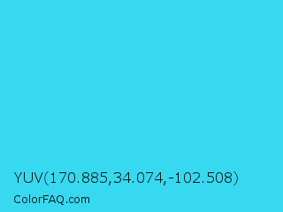 YUV 170.885,34.074,-102.508 Color is a normal cyan color and the nearest color is Turquoise #40e0d0. Hex code #36d9f0 and RGB value is rgb(54,217,240). In RGB color space, this color is composed of 21% red, 85% green, 94% blue, In CMYK color space, this color is composed of 78% cyan, 10% magenta, 0% yellow , 6% black , In HSL color space, this color has a hue angle of 187° , 86% saturation and 58% lightness.