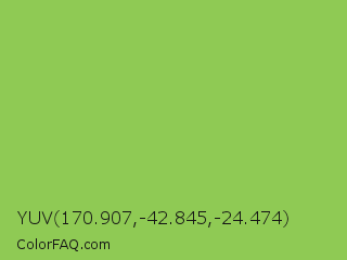 YUV 170.907,-42.845,-24.474 Color is a normal green color and the nearest color is Dollar Bill #85bb65. Hex code #8fca54 and RGB value is rgb(143,202,84). In RGB color space, this color is composed of 56% red, 79% green, 33% blue, In CMYK color space, this color is composed of 29% cyan, 0% magenta, 58% yellow , 21% black , In HSL color space, this color has a hue angle of 90° , 53% saturation and 56% lightness.
