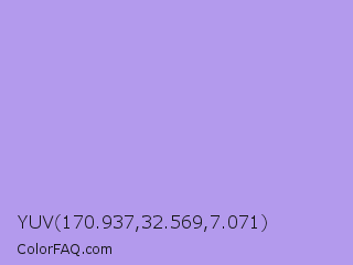 YUV 170.937,32.569,7.071 Color is a light indigo color and the nearest color is Biloba Flower #b2a1ea. Hex code #b39aed and RGB value is rgb(179,154,237). In RGB color space, this color is composed of 70% red, 60% green, 93% blue, In CMYK color space, this color is composed of 24% cyan, 35% magenta, 0% yellow , 7% black , In HSL color space, this color has a hue angle of 258° , 70% saturation and 77% lightness.