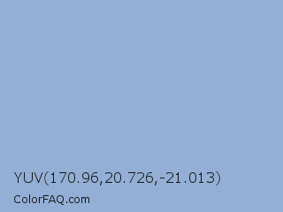 YUV 170.96,20.726,-21.013 Color is a light blue color and the nearest color is Polo Blue #8da8cc. Hex code #93afd5 and RGB value is rgb(147,175,213). In RGB color space, this color is composed of 58% red, 69% green, 84% blue, In CMYK color space, this color is composed of 31% cyan, 18% magenta, 0% yellow , 16% black , In HSL color space, this color has a hue angle of 215° , 44% saturation and 71% lightness.