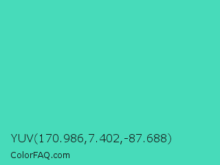 YUV 170.986,7.402,-87.688 Color is a normal cyan color and the nearest color is Eucalyptus #44d7a8. Hex code #47dbba and RGB value is rgb(71,219,186). In RGB color space, this color is composed of 28% red, 86% green, 73% blue, In CMYK color space, this color is composed of 68% cyan, 0% magenta, 15% yellow , 14% black , In HSL color space, this color has a hue angle of 167° , 67% saturation and 57% lightness.