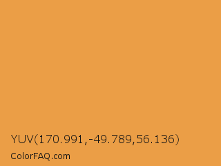 YUV 170.991,-49.789,56.136 Color is a normal orange color and the nearest color is Neon Carrot #ffa343. Hex code #eb9e46 and RGB value is rgb(235,158,70). In RGB color space, this color is composed of 92% red, 62% green, 27% blue, In CMYK color space, this color is composed of 0% cyan, 33% magenta, 70% yellow , 8% black , In HSL color space, this color has a hue angle of 32° , 80% saturation and 60% lightness.