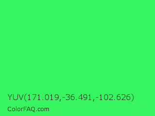 YUV 171.019,-36.491,-102.626 Color is a normal green color and the nearest color is UFO Green #3cd070. Hex code #36f561 and RGB value is rgb(54,245,97). In RGB color space, this color is composed of 21% red, 96% green, 38% blue, In CMYK color space, this color is composed of 78% cyan, 0% magenta, 60% yellow , 4% black , In HSL color space, this color has a hue angle of 134° , 91% saturation and 59% lightness.