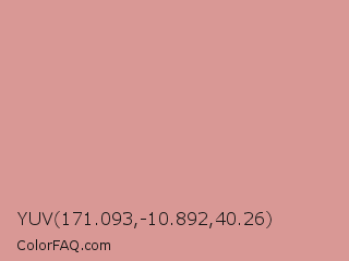 YUV 171.093,-10.892,40.26 Color is a light red color and the nearest color is Petite Orchid #db9690. Hex code #d99895 and RGB value is rgb(217,152,149). In RGB color space, this color is composed of 85% red, 60% green, 58% blue, In CMYK color space, this color is composed of 0% cyan, 30% magenta, 31% yellow , 15% black , In HSL color space, this color has a hue angle of 3° , 47% saturation and 72% lightness.