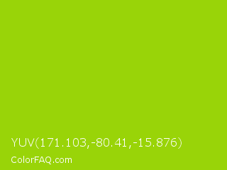 YUV 171.103,-80.41,-15.876 Color is a normal lime color and the nearest color is Sheen Green #8fd400. Hex code #99d408 and RGB value is rgb(153,212,8). In RGB color space, this color is composed of 60% red, 83% green, 3% blue, In CMYK color space, this color is composed of 28% cyan, 0% magenta, 96% yellow , 17% black , In HSL color space, this color has a hue angle of 77° , 93% saturation and 43% lightness.