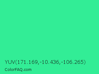 YUV 171.169,-10.436,-106.265 Color is a normal green color and the nearest color is Shamrock #33cc99. Hex code #32ed96 and RGB value is rgb(50,237,150). In RGB color space, this color is composed of 20% red, 93% green, 59% blue, In CMYK color space, this color is composed of 79% cyan, 0% magenta, 37% yellow , 7% black , In HSL color space, this color has a hue angle of 152° , 84% saturation and 56% lightness.