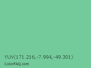 YUV 171.216,-7.994,-49.301 Color is a light green color and the nearest color is De York #7ac488. Hex code #73cb9b and RGB value is rgb(115,203,155). In RGB color space, this color is composed of 45% red, 80% green, 61% blue, In CMYK color space, this color is composed of 43% cyan, 0% magenta, 24% yellow , 20% black , In HSL color space, this color has a hue angle of 147° , 46% saturation and 62% lightness.