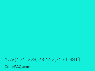 YUV 171.228,23.552,-134.381 Color is a normal cyan color and the nearest color is Bright Turquoise #08e8de. Hex code #12f0db and RGB value is rgb(18,240,219). In RGB color space, this color is composed of 7% red, 94% green, 86% blue, In CMYK color space, this color is composed of 93% cyan, 0% magenta, 9% yellow , 6% black , In HSL color space, this color has a hue angle of 174° , 88% saturation and 51% lightness.