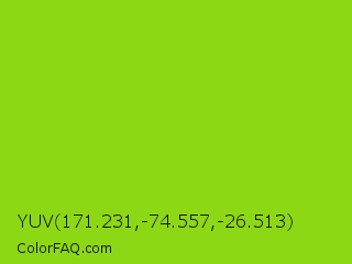 YUV 171.231,-74.557,-26.513 Color is a normal green color and the nearest color is Sheen Green #8fd400. Hex code #8dd814 and RGB value is rgb(141,216,20). In RGB color space, this color is composed of 55% red, 85% green, 8% blue, In CMYK color space, this color is composed of 35% cyan, 0% magenta, 91% yellow , 15% black , In HSL color space, this color has a hue angle of 83° , 83% saturation and 46% lightness.