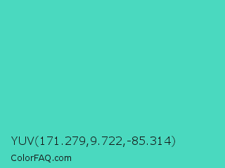 YUV 171.279,9.722,-85.314 Color is a normal cyan color and the nearest color is Medium Turquoise #48d1cc. Hex code #4ad9bf and RGB value is rgb(74,217,191). In RGB color space, this color is composed of 29% red, 85% green, 75% blue, In CMYK color space, this color is composed of 66% cyan, 0% magenta, 12% yellow , 15% black , In HSL color space, this color has a hue angle of 169° , 65% saturation and 57% lightness.